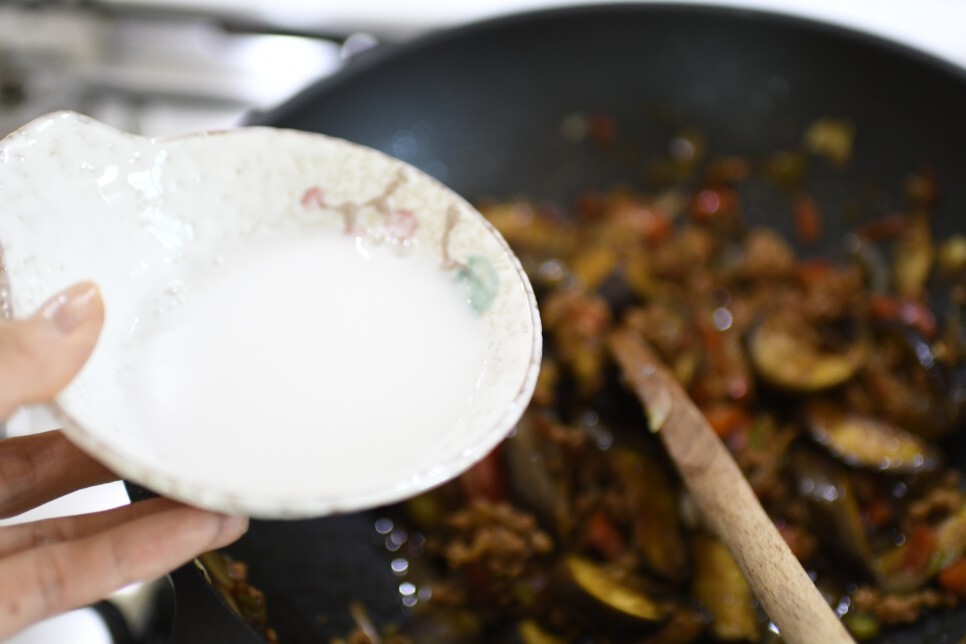 채소 ~> 가지를 강불로 빠르게 볶아주며