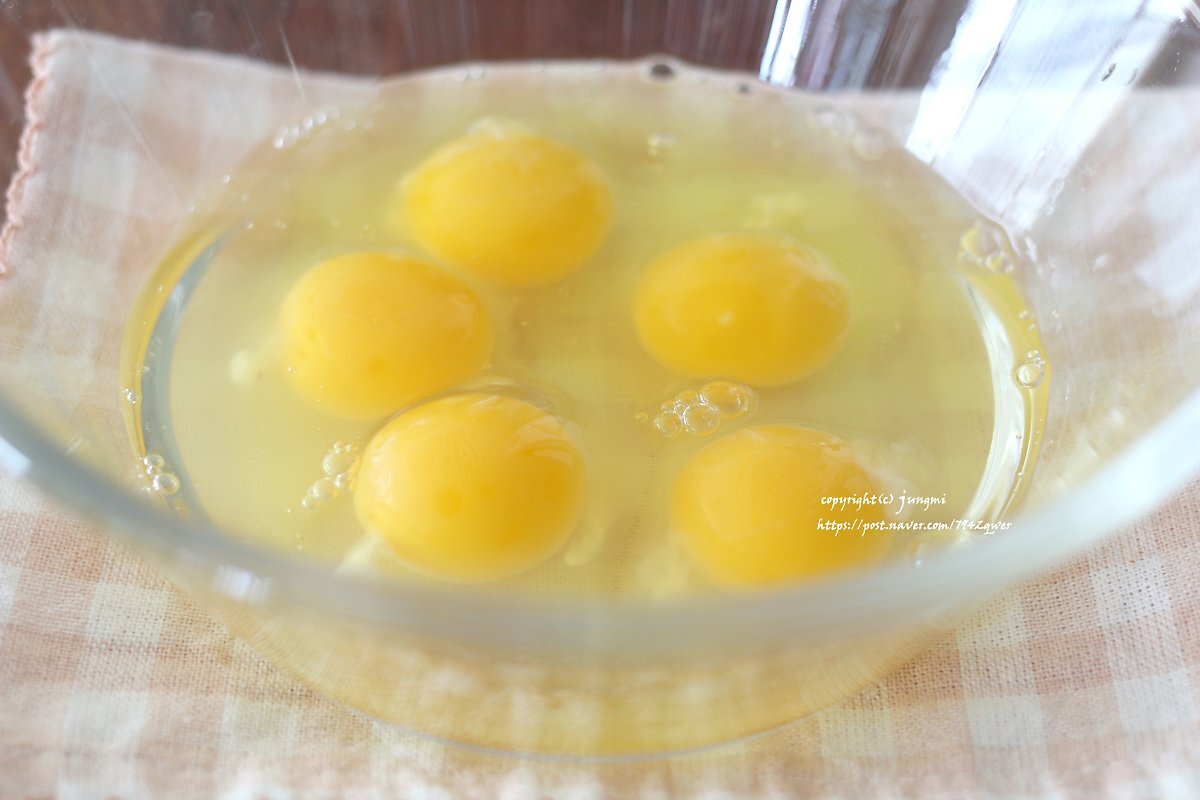 달걀 5개는 넉넉한 용기에 풀어주고, 여기서 부드럽게 만들고 싶다면 알끈은 제거해 주는 게 좋아요.