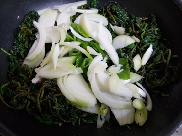 다진 파 2T를 볶아 향을 내주세요. 여기에 깻잎순을 넣어 1분 정도 볶아주세요.