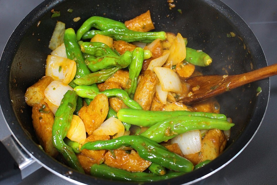 이어서 꽈리고추와 양파를 넣고 볶아주면 되는데
