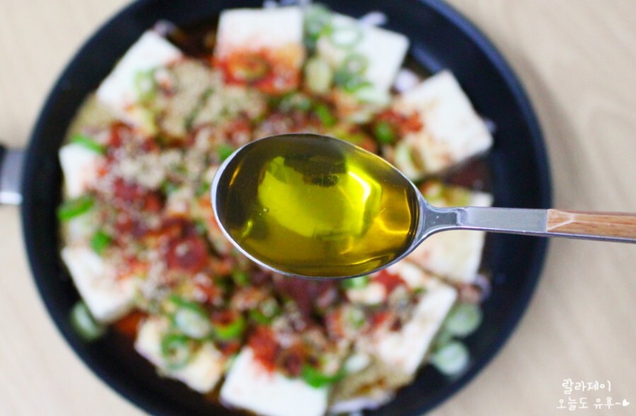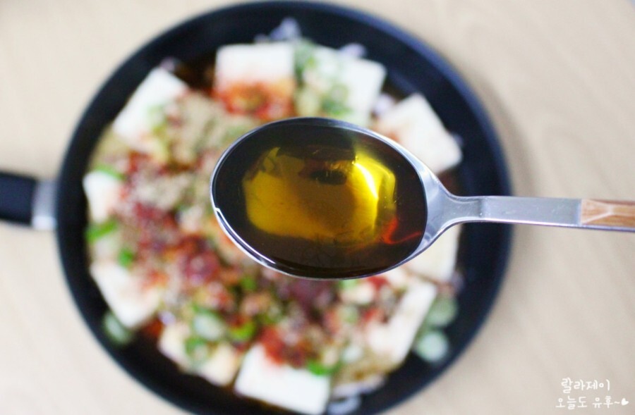 이번 두부조림은 들기름도 들어간답니다. 그래서 더 맛있었던 거 같아요! 저는 전에 사놓은 들기름이 있어서 넣어줬는데 만약 참기름밖에 없으면 한 숟가락 정도만 넣으면 좋을 것 같아요. 들기름은 향이 좀 은은한데 참기름은 확 고소하잖아요~ 맛이 너무 진할 것 같아요.