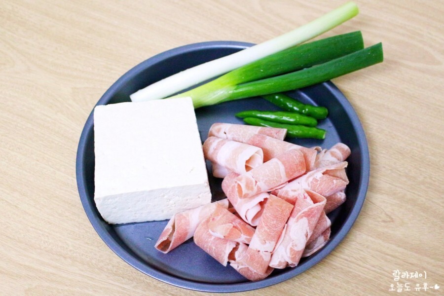 백종원 두부조림을 만들기 위해 일단 두부 한 모를 준비합니다. 두부는 찌개두부, 부침 두부 아무거나 상관없고요. 가장 중요한 재료는 바로 대패삼겹살이에요. 물론 삼겹살이 없어도 맛은 있겠지만 대패삼겹살이 들어가면 훨~씬 맛있어지거든요. 대파도 한 대 준비하고 청양고추는 2개 준비합니다. 저는 3개~