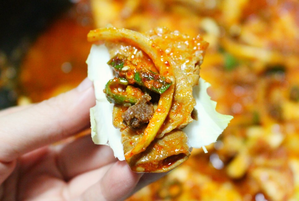 고기랑 두부랑 양파까지 같이 먹으면 이건 완전 안주로 딱!! 물론 이날은 그냥 밥반찬으로 먹었어요. 사실 술도 준비해놨었는데 밥 비벼 먹고 쌈 싸 먹고 하다 보니 술 먹는 것도 잊고 허겁지겁 먹었지 뭐예요~