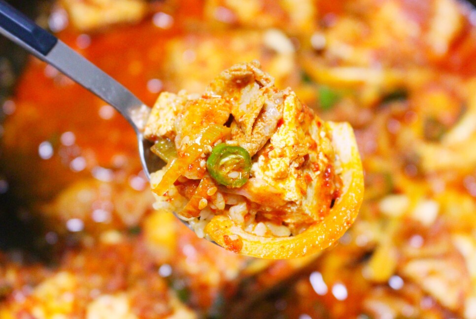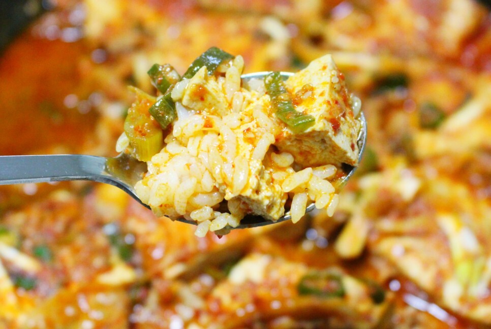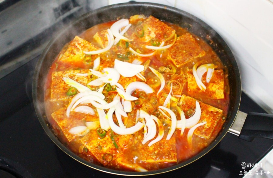 바글바글 끓으면서 아래에 있던 물이 올라와서 양념이 섞이긴 하지만 두부 위에 있는 파나 마늘까지는 잘 안 섞이길래 주걱으로 살살 펼쳐줬고요. 끓기 시작하면 칼칼한 냄새가 나는데 냄새부터 정~말 맛있어요! 약간 두부조림 냄새도 나면서 뭔가 매운탕 같은 냄새도 있고 말이죠~