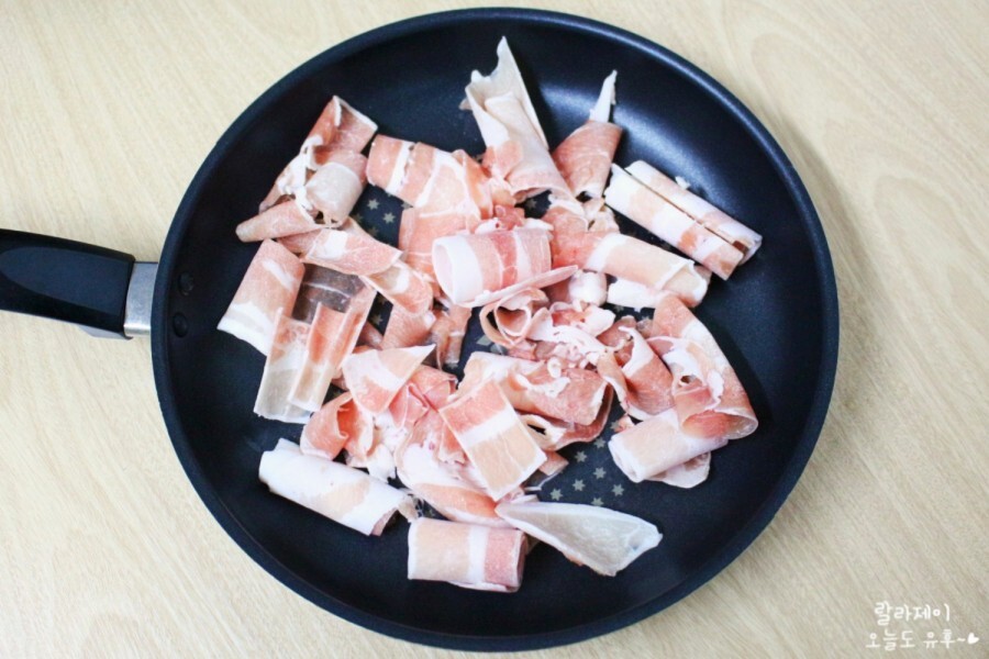 이제 프라이팬에 모든 재료와 양념을 다 올린 후에 가스불에 올릴 건데요. 한꺼번에 양념까지 다 넣으니 너무 편하고 좋더라고요. 먼저 대패삼겹살을 깔아줍니다.