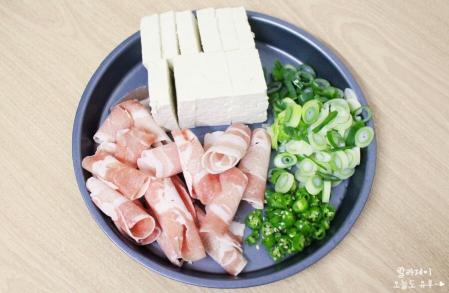 저는 마트에 파는 초당두부를 사용했는데 보통 두부보다 사이즈가 좀 컸어요. 먹어보니 그냥 일반 두부 한 모가 둘이 먹기 딱 좋은 양이더라고요. 두부는 적당한 두께로 썰어두고요. 대파와 청양고추는 송송 썰어주세요. 그리고 대패삼겹살은 좀 큰 것들은 잘라주는데 가위를 구멍에 넣고 샥~ 잘라주면 돼요.