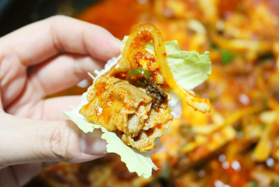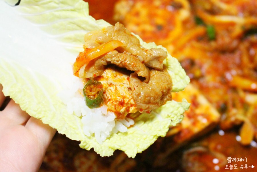 고기는 두부 밑에 깔려 있어서 약간 찌부 상태로 익었지만 그래도 야들야들하니 맛있었어요. 전에 만든 대패삼겹살 두루치기랑은 또 다른 맛인데 진짜 딱 쌈을 부르는 맛이더라고요.