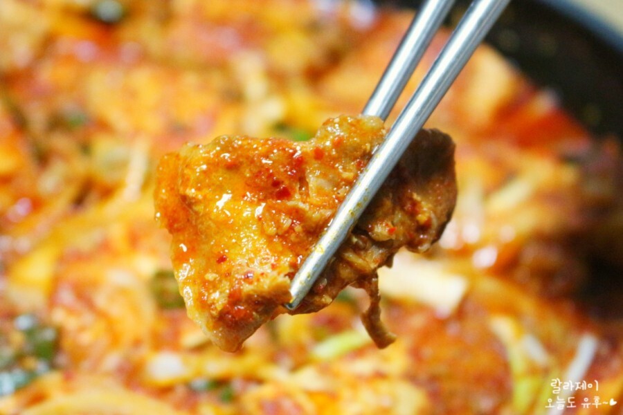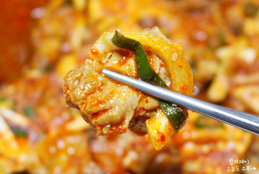 바글바글 끓으면 중약 불로 줄여서 졸여주는데요. 끓일 때는 보글보글 올라와서 국물이 많아 보이지만 막상 불을 끄면 양념이 확 줄어들거든요. 그래서 너무 오래 끓이면 안 되고 센 불보다는 중약 불로 끓이는 게 좋아요. 아깝게 다 태워버리면 안 되잖아요~이때 양념을 살짝 떠먹어봅니다. 간을 맞춰야 하니깐요.