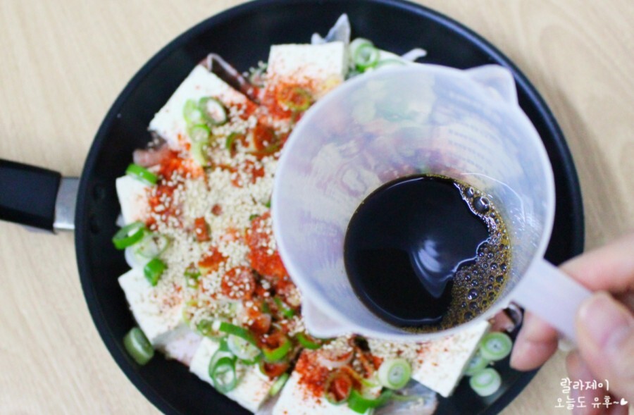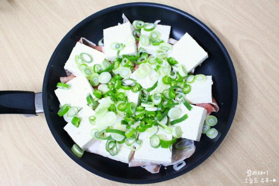 그리고 썰어놓은 두부를 촥촥 올려주세요. 두부가 남지 않을까? 걱정했는데 한 판에 딱 맞게 들어가더라고요! 음~ 이렇게 딱딱 맞으면 요리가 잘 될 것 같은 예감이 들어서 좋아요.