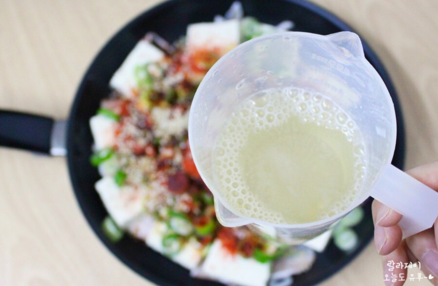 물도 한 컵 넣어줍니다. 저는 양념이 좀 자작하게 있으면 좋겠다 싶어서 물을 좀 많이 넣었어요. 한 컵 반 정도? 넣었는데 딱 좋더라고요. 국물에 밥 좀 비벼 먹고 싶다 하시면 처음부터 물을 반 컵 정도 더 넣으시고 두부랑 건더기 위주로 먹고 싶다 하시면 딱 한 컵 넣으면 맞아요.