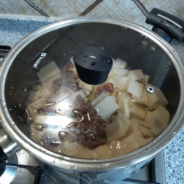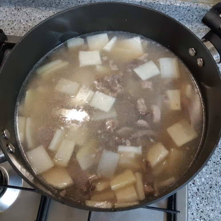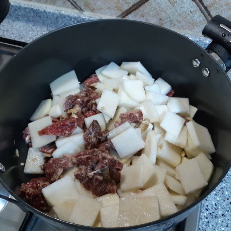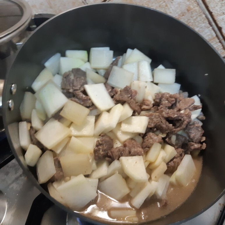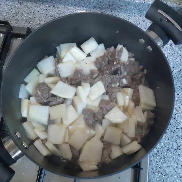 고기가 반쯤 익을때 미리 썰어놓은 무를 넣고 볶은후 물 500ml 붓고 푹 끓여주세요