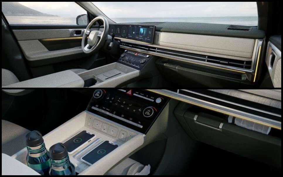 또한 눈에 띄는 점은 스마트폰 무선 충전 패드가 2대가 마련되어 있다는 점. 그리고 기어 노브가 있어야 할 곳에 보이지 않는 걸로 보아 컬럼식 기어를 채택하여 센터 트레이의 수납성을 향상시킨 것으로 보입니다.