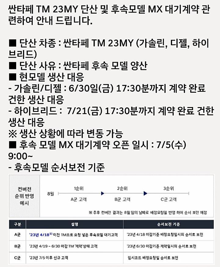A군 (1군)- 2023년 4월 18일 이전 TM모델로 계약을 진행한 MX5 풀체인지 대기고객이 1군 순서입니다.