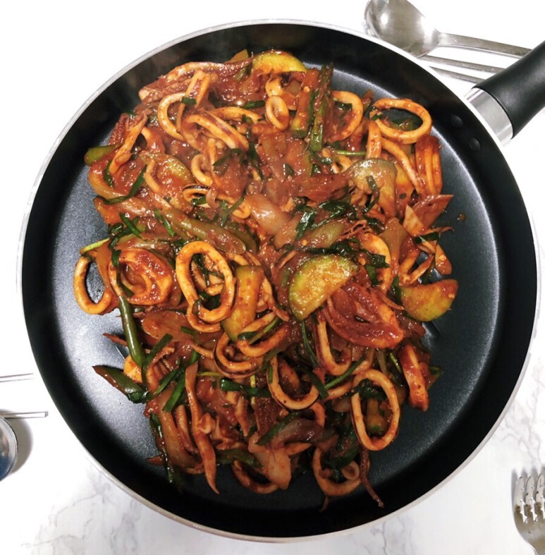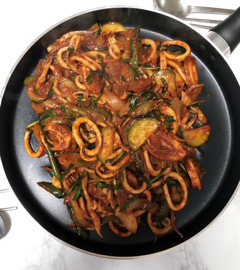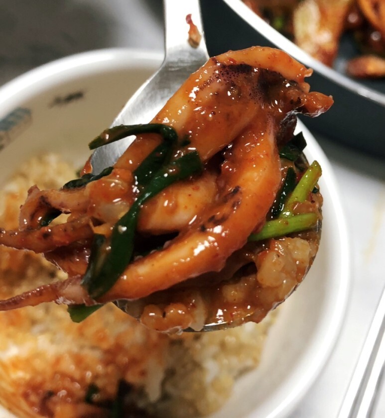 매콤한 오징어볶음을 좋아하는 남편 덕분에 #오징어볶음만들기 달인이 된 거 같아요 ㅋㅋ 국물이 많은 건 싫어하는 점점 입맛 까다로워지는 남편 취향에 맞춘 오징어볶음