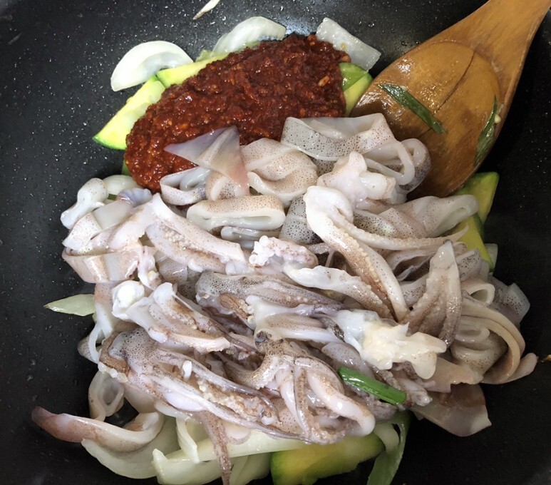 양파가 투명해질 때 오징어랑 양념장 투하 ~