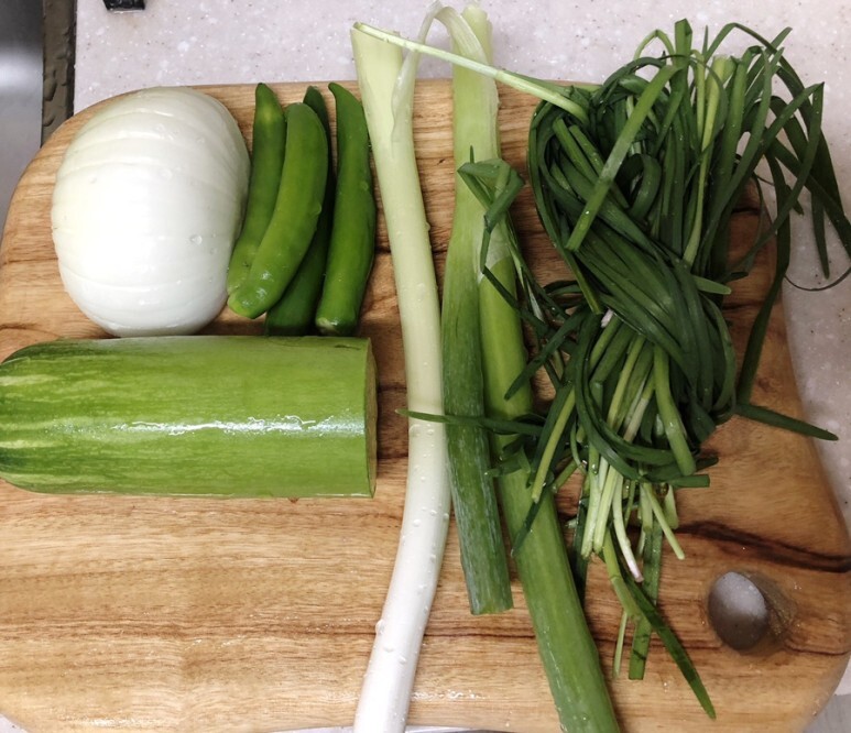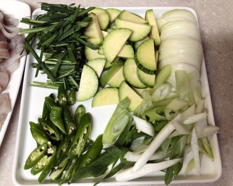 오징어볶음 재료를 먼저 준비해 주었어요 ~ 오징어볶음에 넣는 야채는 냉장고에 있는 야채를 넣어서 매번 조금씩 다른데요 ~ 백종원 오징어볶음 레시피처럼 양배추를 넣어도 맛있는데 오늘은 양배추가 없네요 ㅋㅋ 오늘은 양배추 대신 애호박을 준비했어요 ~~ 양파랑 청양고추 대파는 필수 ~ ㅋㅋㅋ 깻잎이 있으면 깻잎을 넣는데 오늘은 부추가 있어서 부추를 넣기로 했답니다