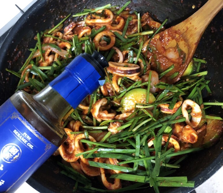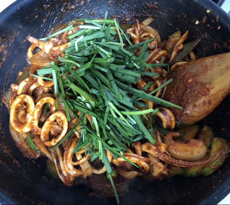 오징어가 익으면 부추랑 참기름 한 방울을 넣고 쉐킷 쉐킷 ~ 부추가 숨이 죽을 만큼만 볶으면 끝이에요 ~