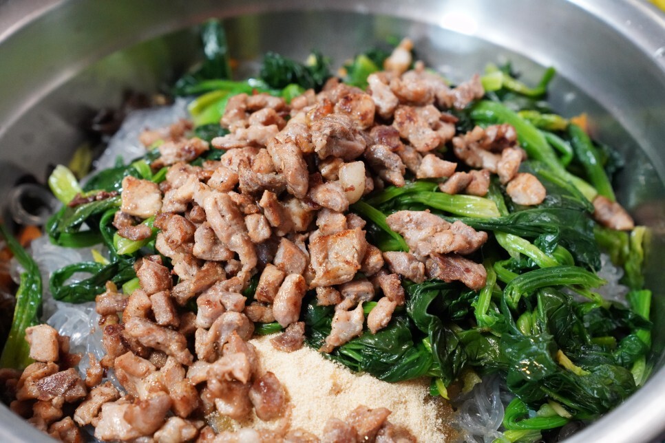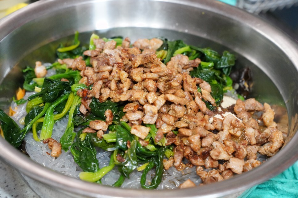 큰 그릇에 볶은 야채와 시금치, 고기를 담아 주세요.