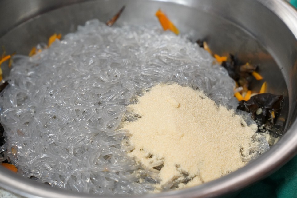 잡채당면과 목이버섯은 미지근한 물에서 2~3시간 이상 담가 불리시면 됩니다.