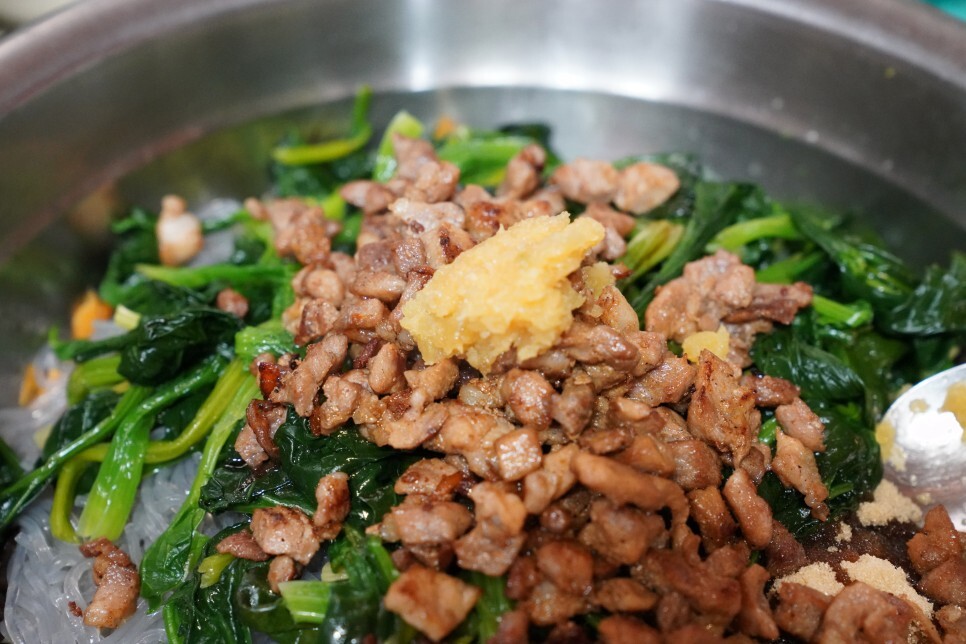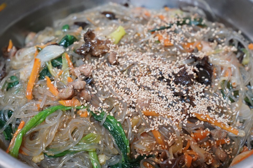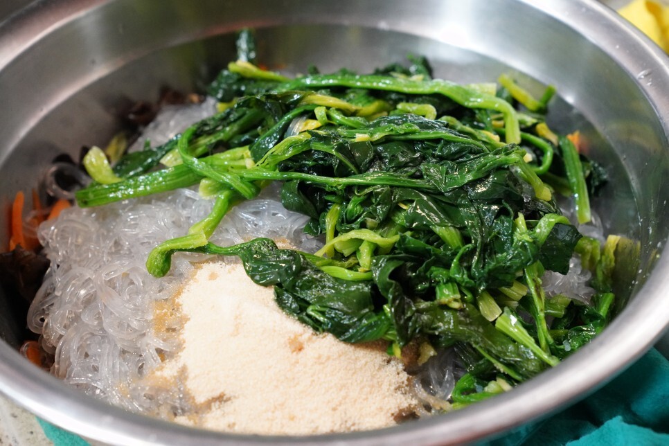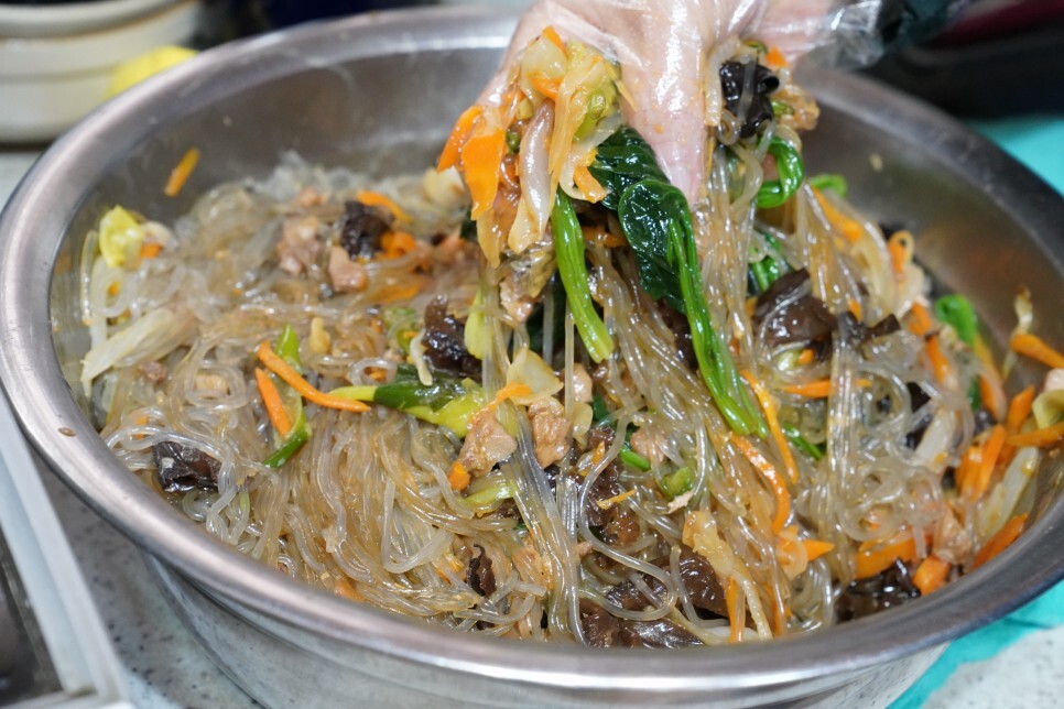 불린 당면과 양념장을 넣고 삶은면을 건져 볶아놓은 재료에 양념장 넣고 훌훌 털어가며 가볍게 무쳐주시면 됩니다.