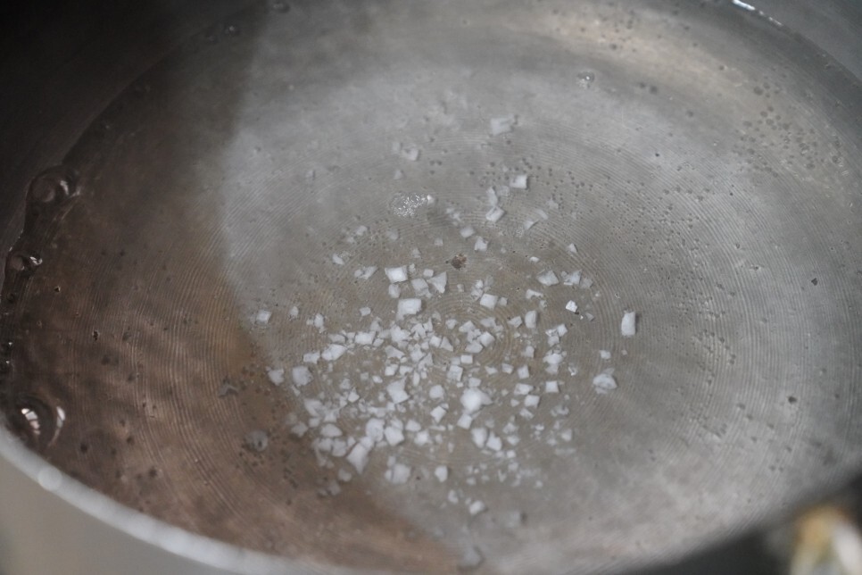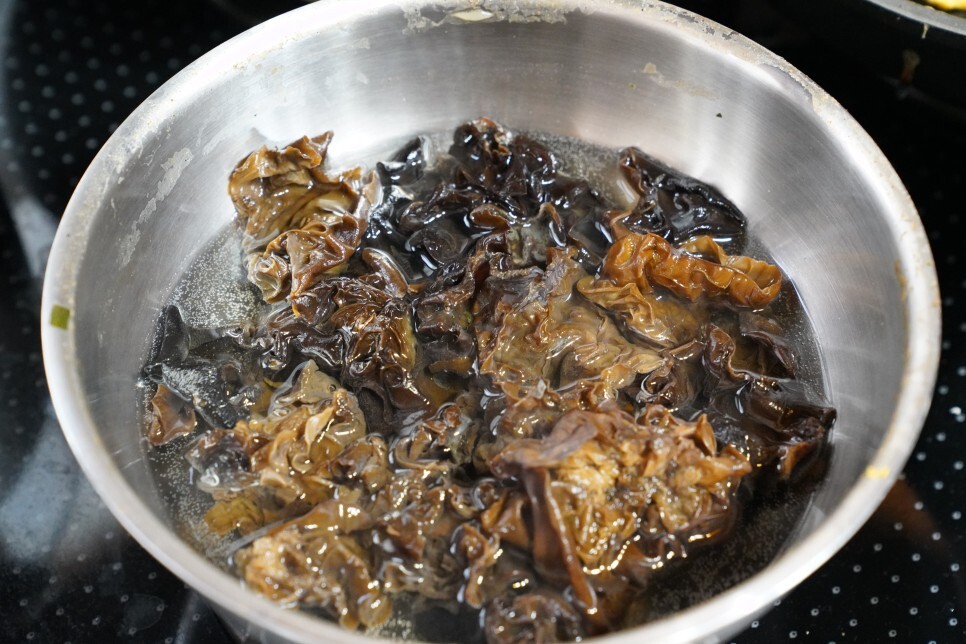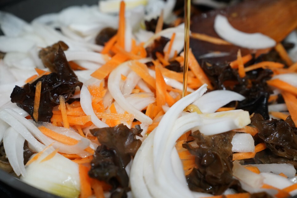 달군 팬에 식용유를 두르고 목이버섯, 당근, 양파, 대파를 넣고 살짝 볶다가 소금과 후춧로 간을 해주세요.
