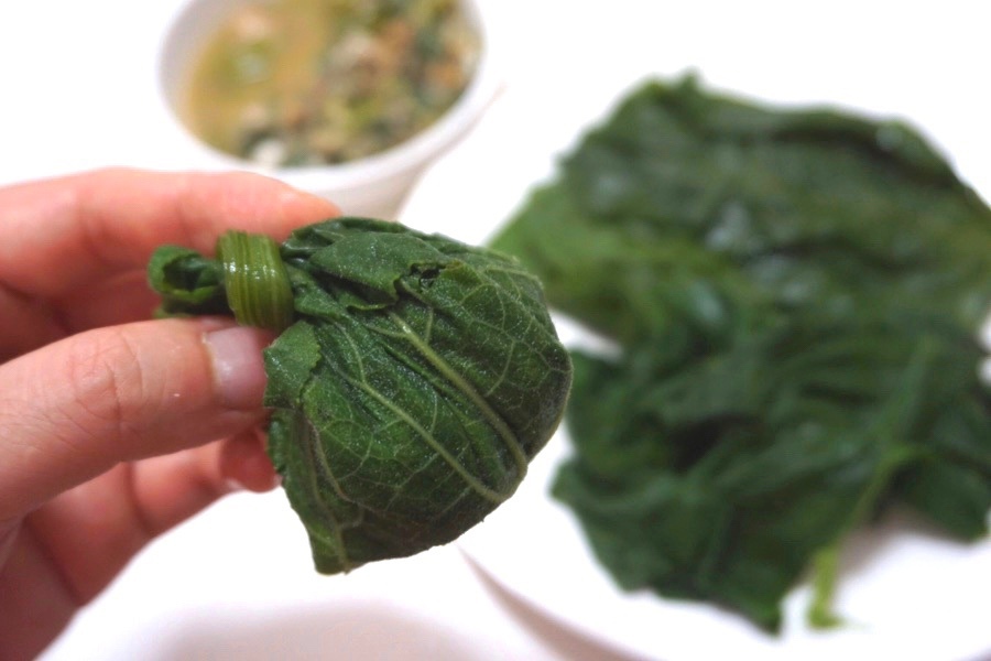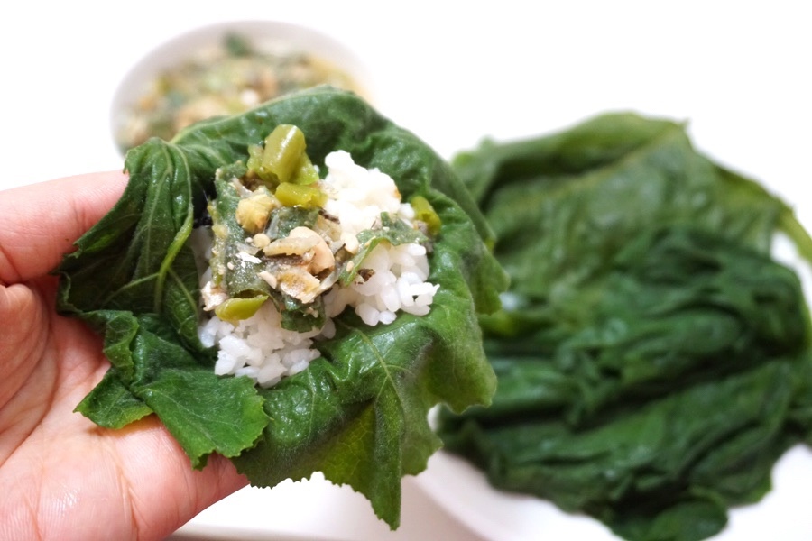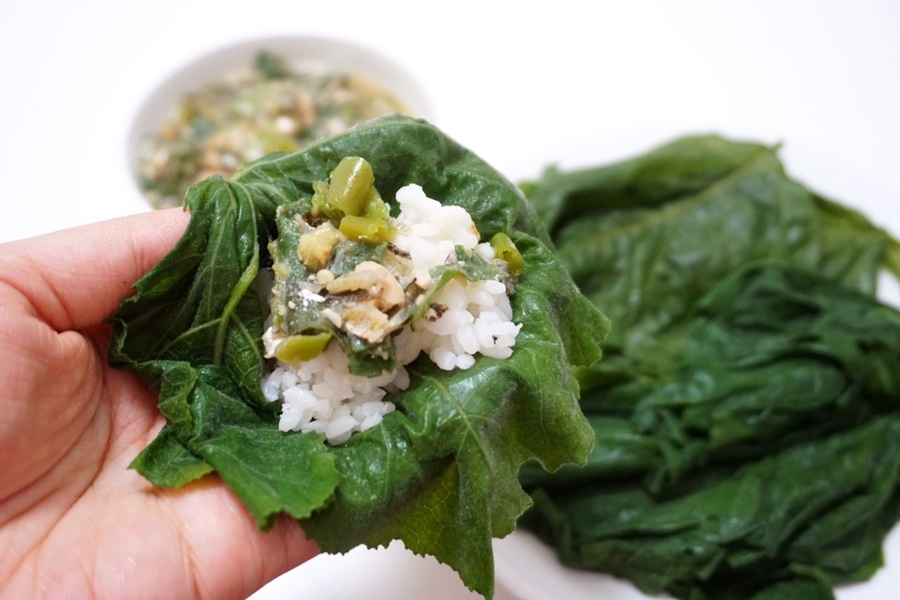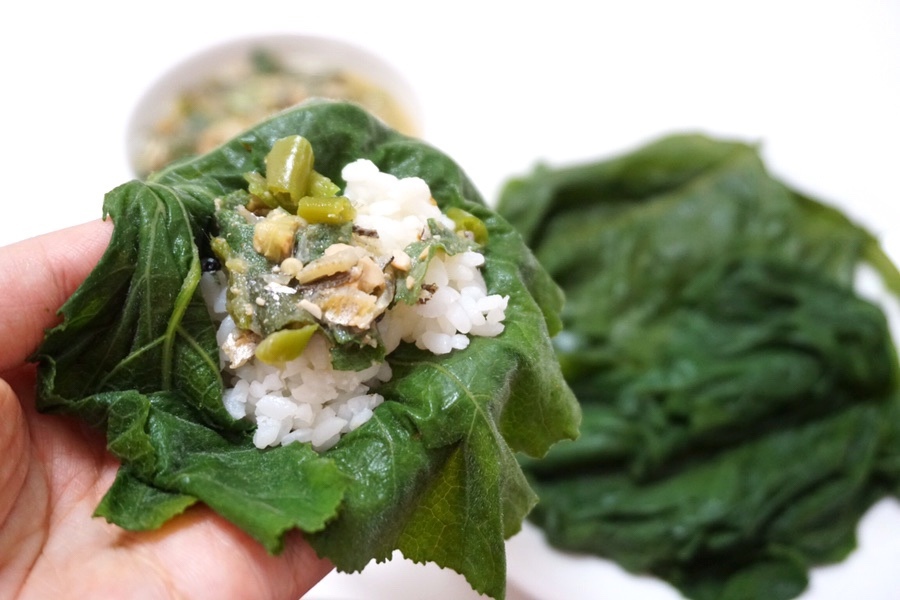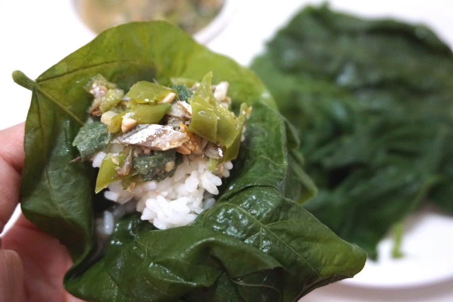 부드럽게 잘 쪄진 잎에 밥과 쌈장 올려서 냠냠~
