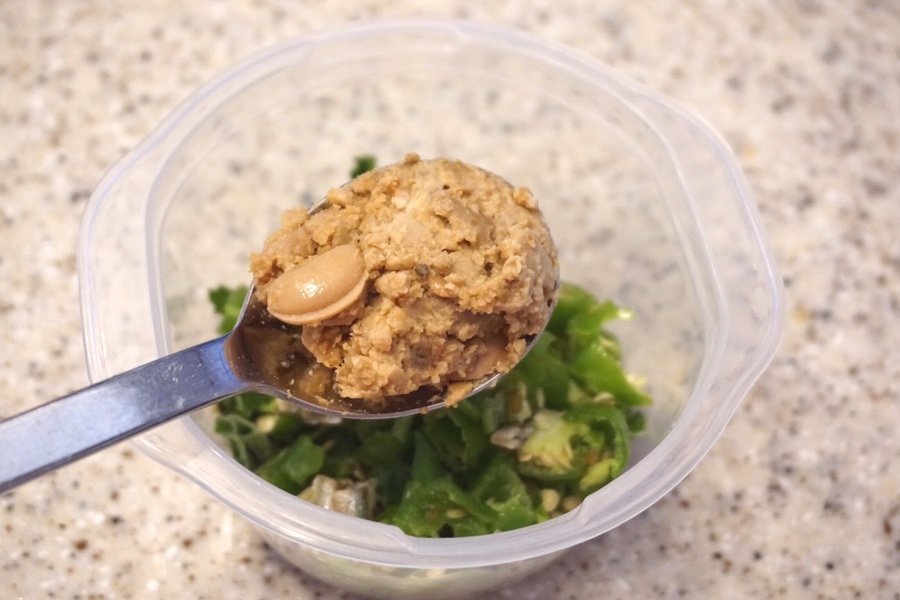 두부 1/3모, 된장 2숟갈 푹푹, 고추장 1숟갈 푹, 다진 마늘 1숟갈, 설탕 1/2숟갈, 올리고당 1숟갈, 참기름 1숟갈, 깨소금 또는 통깨 1숟갈, 다진 호박씨 1숟갈, 다진 해바라기씨 1숟갈, 다진 호두 1/숟갈